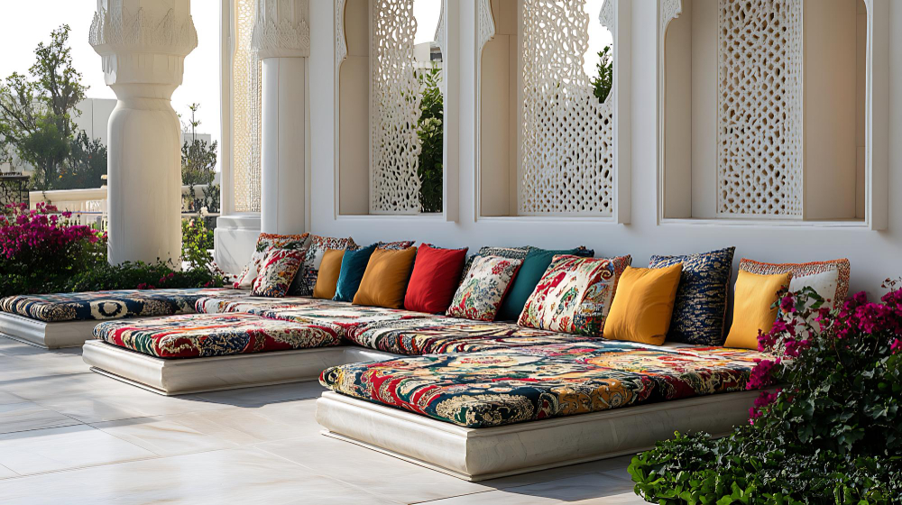 Majlis is a traditional Arabic hospitality where family and friends are comfortable and relaxed. There's a low cushioned seating arrangement on the periphery for comfortable conversation in an outdoor majlis setting. Luxurious textures, jewel-toned cushions, and old rugs provide that coziness. Add cultural trinkets like Arabic lanterns and coffee pots for that pinch of authenticity. Low seating will cool down the visitors during summer, and outdoor spaces get lovely evening breezes, perfect for Ajman weather and parties.